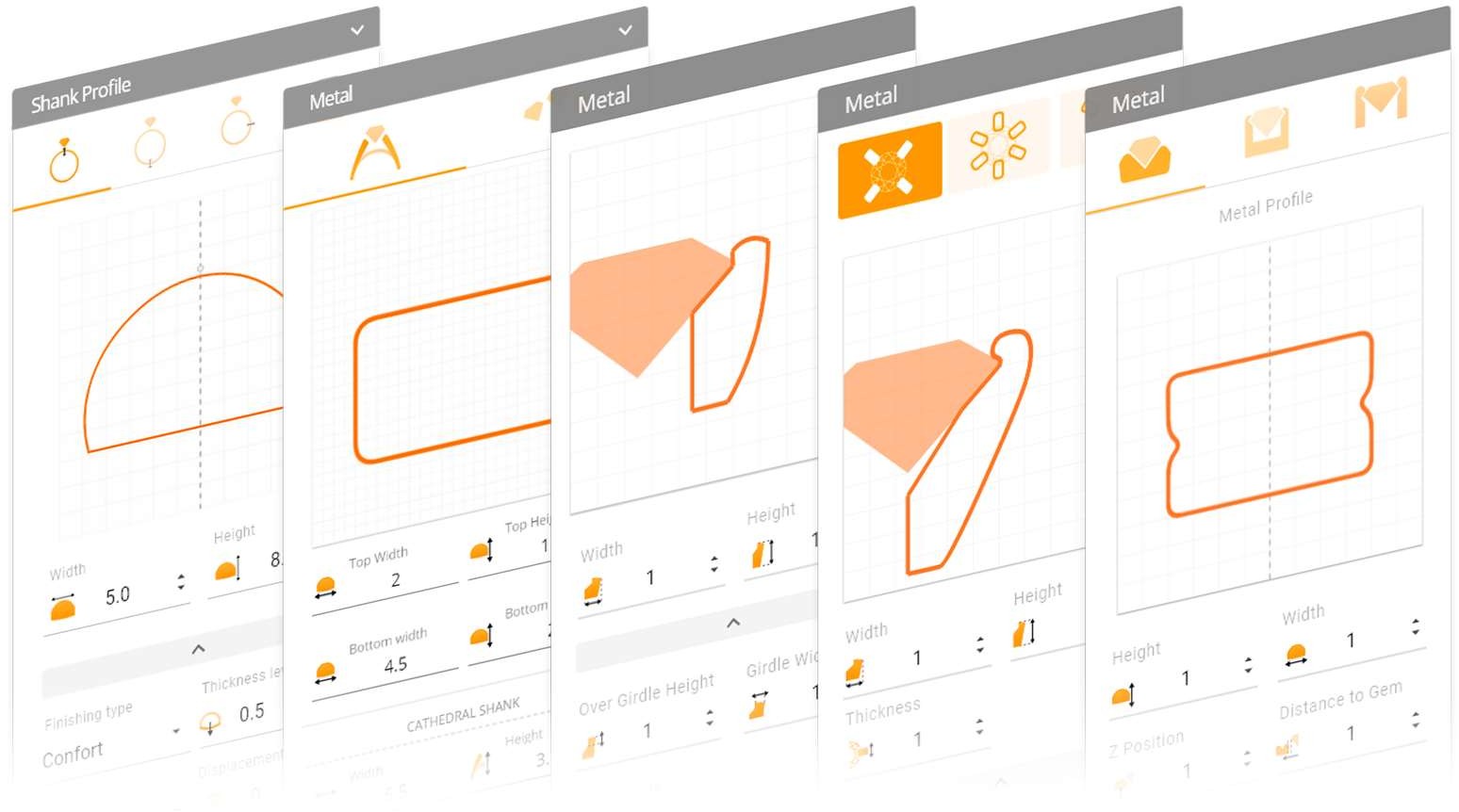 One of the most powerful features is the intuive parametric. It allows us to change any property of our design, from finger size, gem, profile, including the thickness of prong